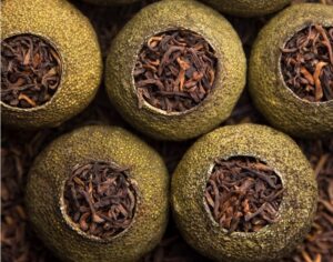 Усередину мандарина найчастіше вкладають шу пуер — м’який, глибокий і землистий за характером чай. Водночас деякі майстри використовують інші сорти — шен пуер чи навіть улун, але саме шу вважається класичним вибором, бо він найкраще розкривається у парі з цитрусовими нотами.