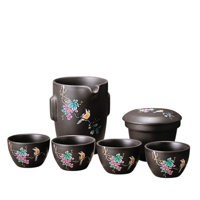 Комплект включає заварник об’ємом 250 мл із вбудованим ситом для зручного заварювання, а також піалу на 100 мл. Піала виконує подвійну функцію: вона використовується як кришка і як чашка для пиття. Такий набір стане ідеальним для як для особистого використання, так і для створення особливої атмосфери під час чайної церемонії, додаючи ноту благородності та вишуканості у кожен ковток.