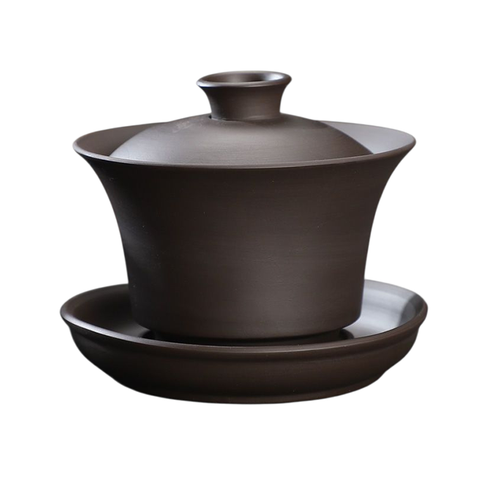 Ця гайвань виконана з ісинської фіолетової глини (цзи ша) — унікального природного матеріалу, який цінується серед знавців за його особливу структуру. Її поверхня темна, матова, злегка шорстка на дотик, що додає відчуття природності та забезпечує надійне утримання в руках. Кожна деталь цієї гайвані — акуратна, рівна, ретельно продумана. Кришка щільно прилягає до чаші, злив плавний і рівномірний, а сама гайвань відчувається як міцний, збалансований інструмент.