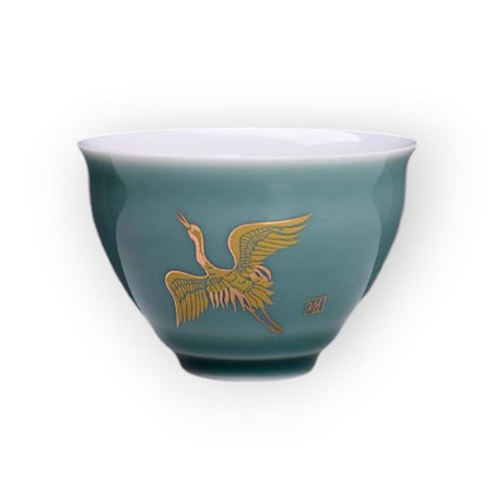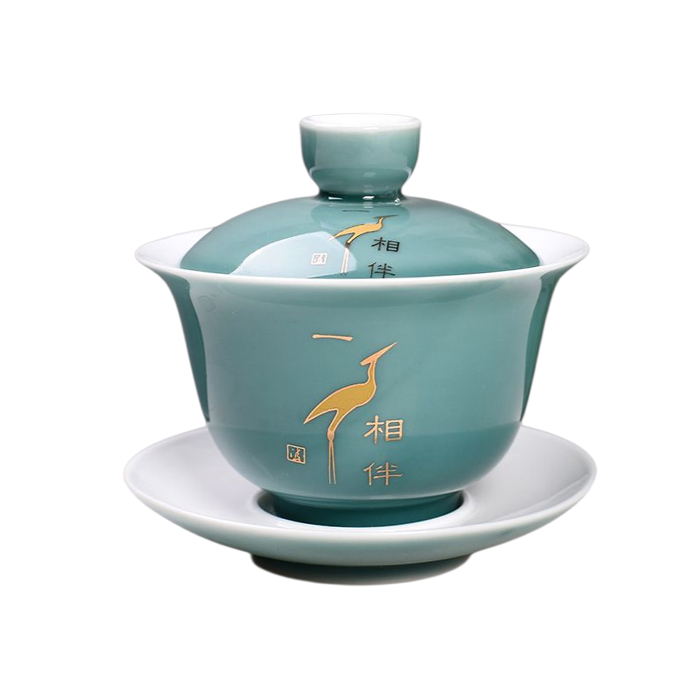 Гайвань виглядає елегантно й витончено: її колір нагадує кришталеву воду в глибокому озері бірюзового відтінку. На поверхні зображено золотого лелеку в польоті що нахилив голову вниз, ніби полює або шукає щось важливе. У китайській культурі лелека символізує пильність, цілеспрямованість і мудрість, що веде до успіху. Такий образ уособлює прагнення до руху, внутрішньої сили та гармонії з навколишнім світом, відображаючи дух спокою та зосередженості, який супроводжує чайну церемонію.