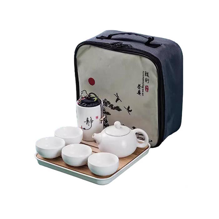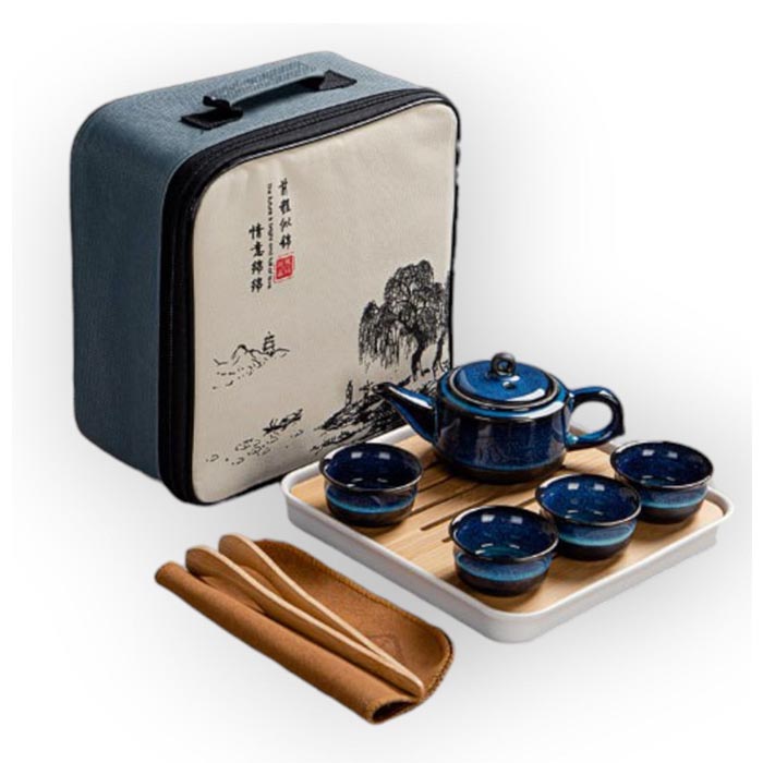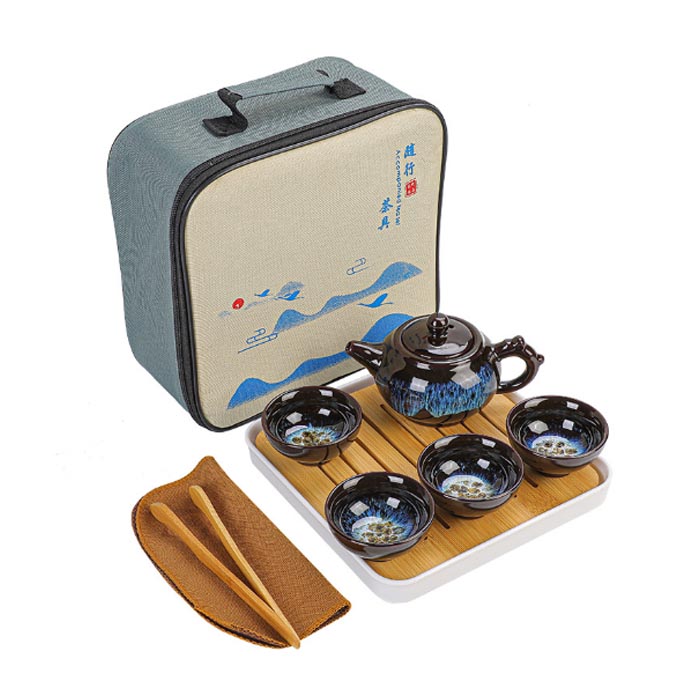 Дизайн цього набору поєднує простоту форм і природну текстуру з продуманою практичністю. Зовні чайник і піали мають теплий світло-коричневий відтінок із шорсткою, смугастою поверхнею, що нагадує про природну красу глини. Легка та практична бамбукова чабань з темним пластиковим піддоном створює відчуття справжнього чайного простору. Спеціальний кейс має відділення для чайника, піал, чабані та аксесуарів, фіксуючи їх під час транспортування, тож набір зручно брати із собою на роботу, у подорож або на природу.