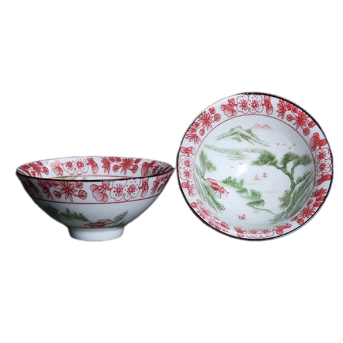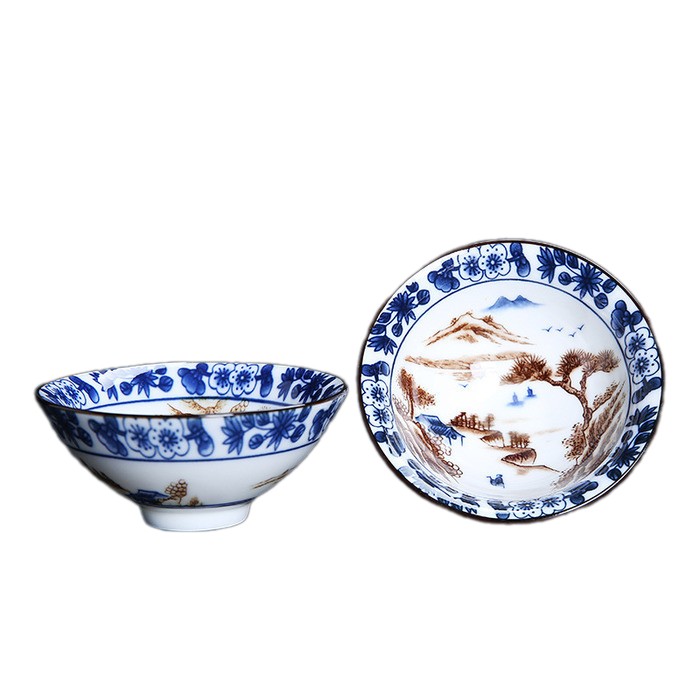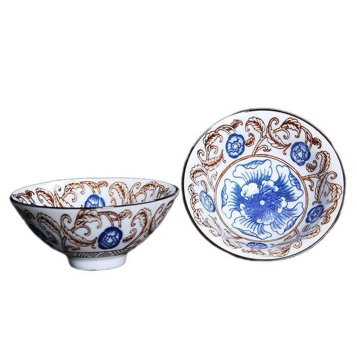 Ця піала оздоблена поєднанням синіх візерунків і червоних квітів, що створюють гармонійний контраст. Сині лінії символізують спокій і ясність думок, тоді як червоні пелюстки уособлюють життєву силу, пристрасть і процвітання. Такий малюнок поєднує енергію та врівноваженість, нагадуючи про важливість гармонії між духом і серцем.