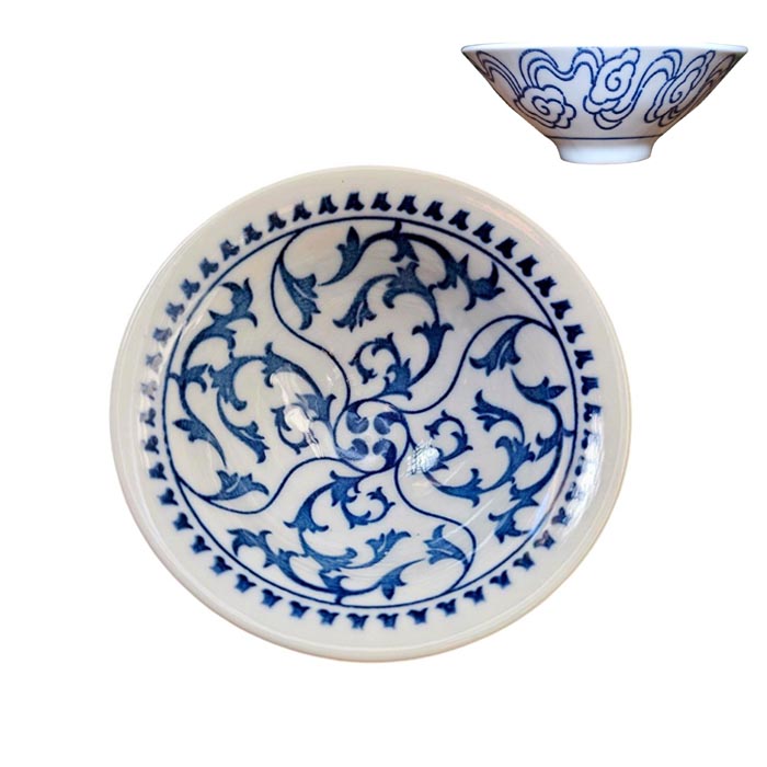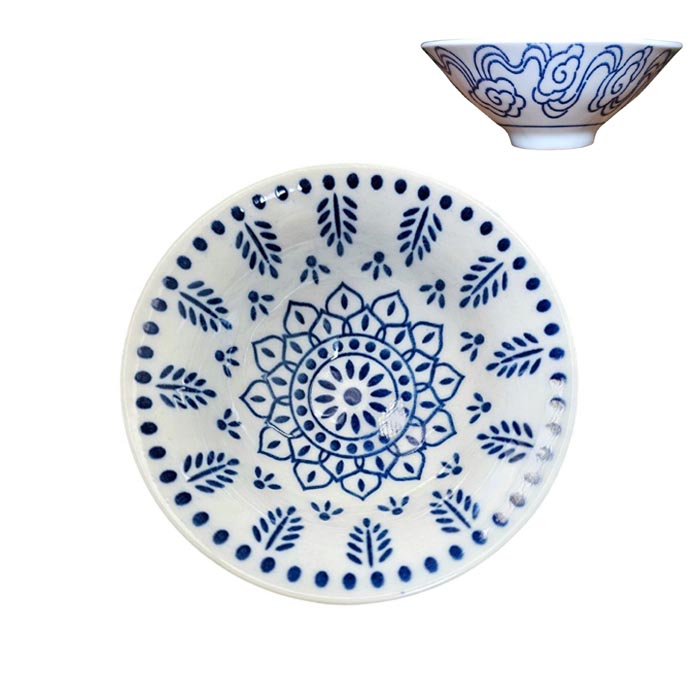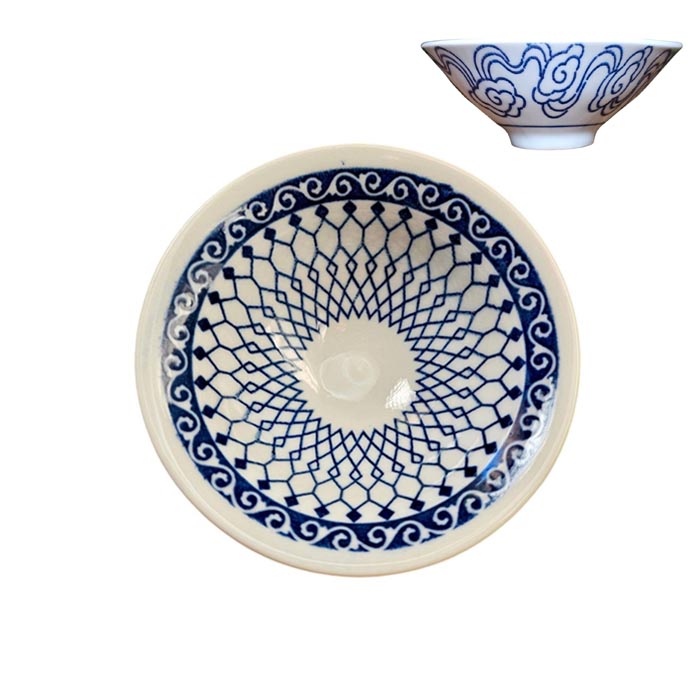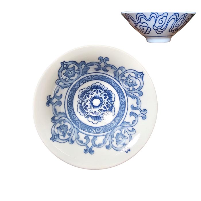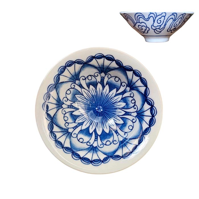 Синій розпис традиційно використовують для порцелянового посуду через яскравість і стійкість до високих температур. Він чітко підкреслює деталі малюнка і передає дух китайського мистецтва. На білому фоні зображена стилізована геометрична квітка лотоса, що символізує чистоту, гармонію й духовне відродження.
