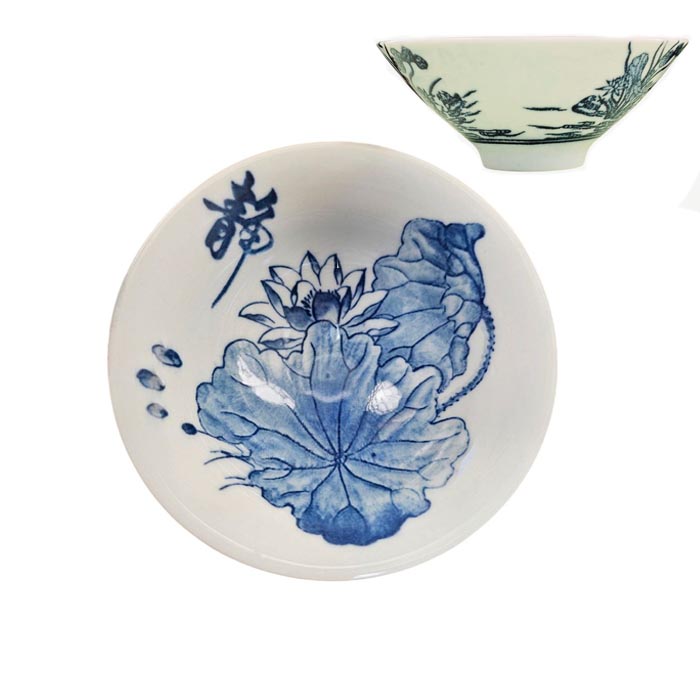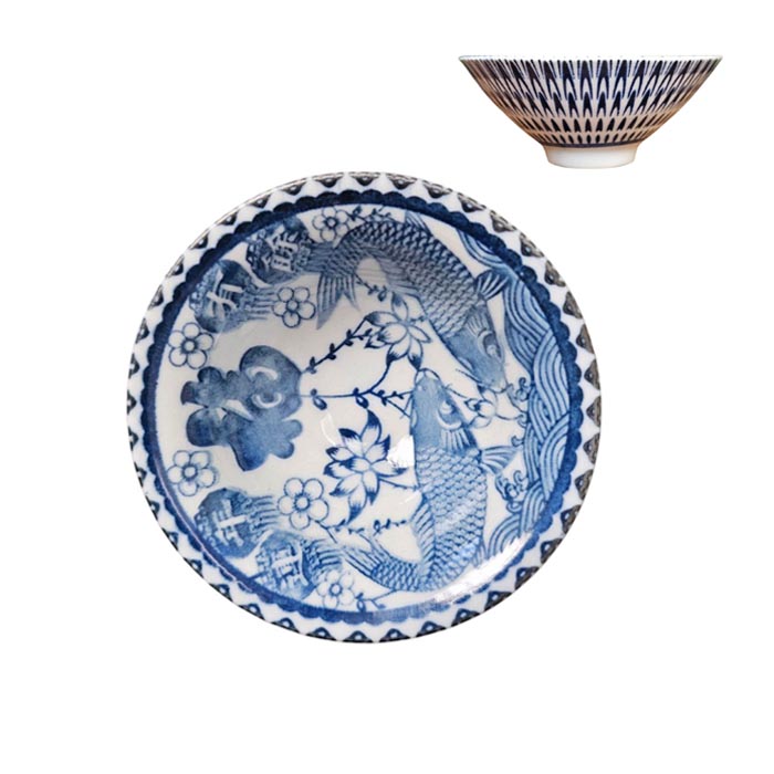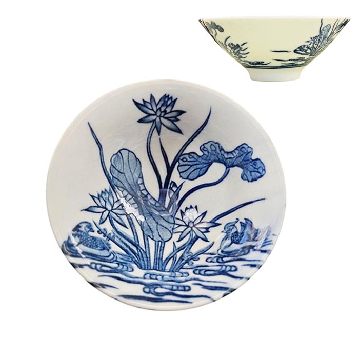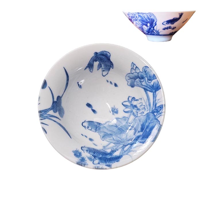 Синій розпис традиційно використовують для порцелянового посуду через яскравість і стійкість до високих температур. Він чітко підкреслює деталі малюнка і передає дух китайського мистецтва. На піалі зображені коропи, які плавають у водоймі, що символізує успіх, наполегливість і процвітання.