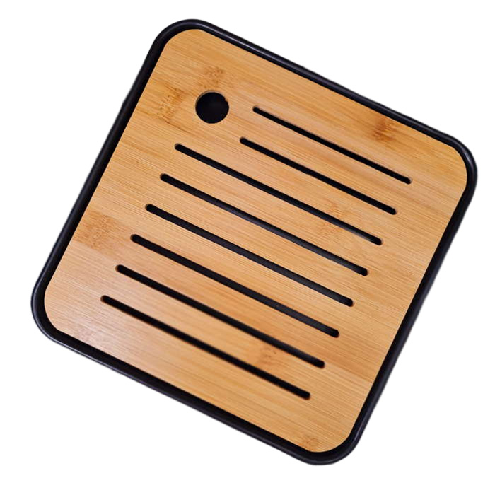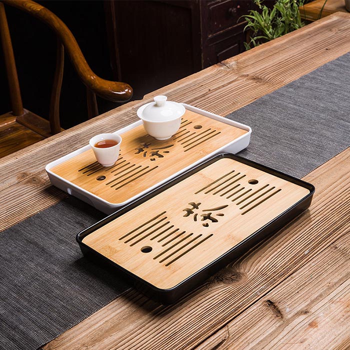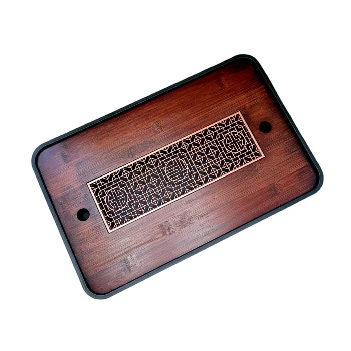 Традиционно чабани изготавливают из бамбука — природного, лёгкого и долговечного материала. Верхняя часть этой модели выполнена из светлого бамбука с приятной текстурой, которая создаёт контраст с чёрным поддоном. Закруглённые углы добавляют форме элегантности и делают её удобной в использовании. Особым акцентом чабани является вырезанный по центру иероглиф «чай». Этот символ является сердцем китайской чайной культуры, знаком гармонии, спокойствия и глубокого уважения к традиции. Иероглиф украшает верхнюю панель и одновременно служит сливными отверстиями для отвода жидкости в поддон.