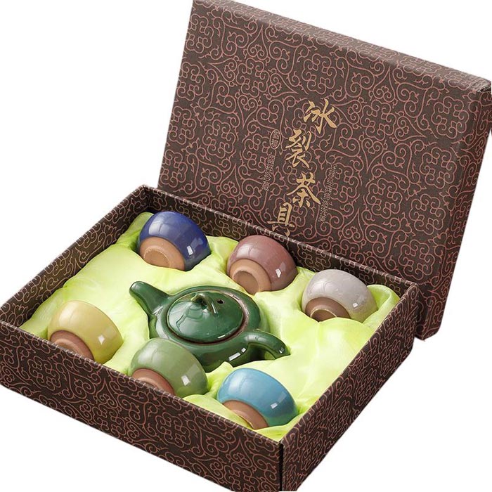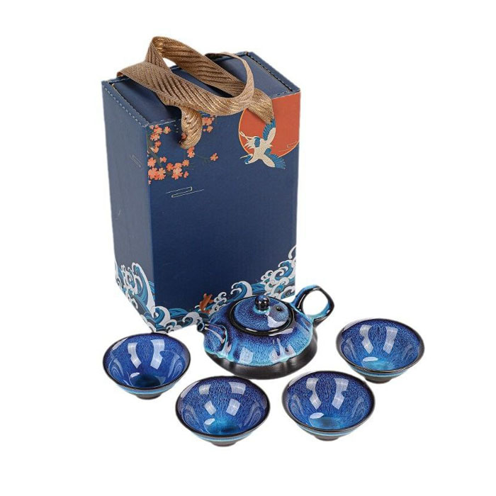Этот набор для чаепития — настоящее воплощение красоты, рождённой огнём. Чайник объёмом 150 мл и четыре пиалы по 40 мл созданы из высококачественной горной каолиновой глины, обогащённой природными минералами. Каждый элемент — результат мастерской ручной работы, где форма, фактура и цвет слились в единое целое. Набор упакован в стильную синюю подарочную коробку, которая подчёркивает его изысканность и делает прекрасным подарком для ценителей чайной эстетики.